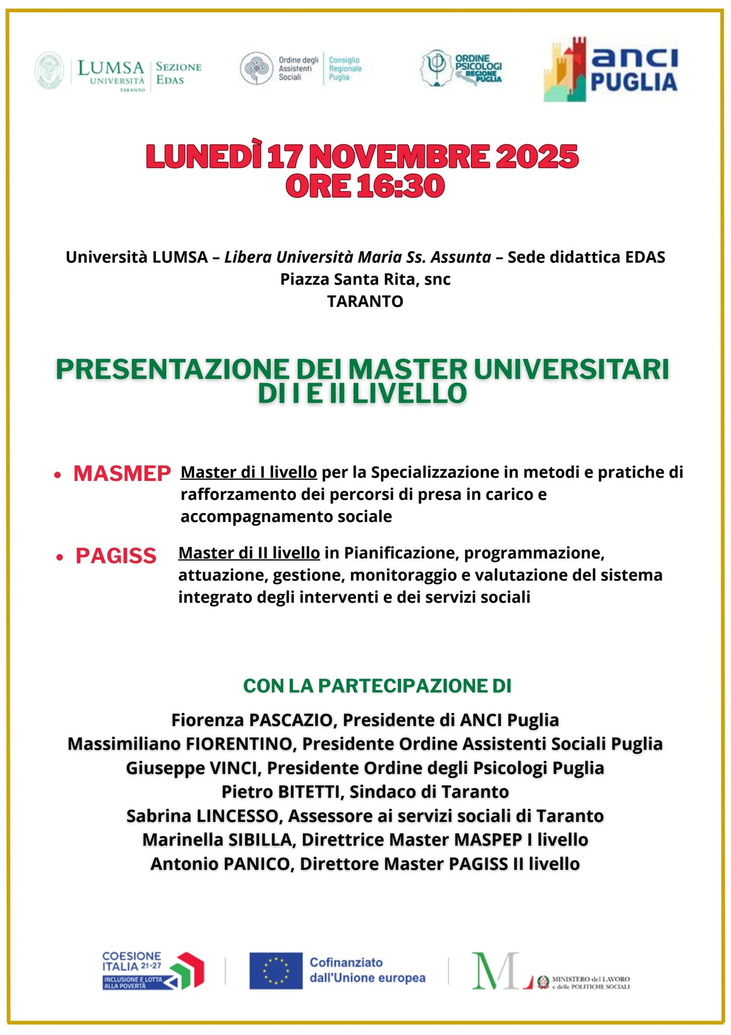 Oggi lunedì 17 novembre 2025 si terrà presso l’Università LUMSA di Taranto, la Presentazione dei Master Universitari di I e II livello interamente finanziati dal Ministero del Lavoro e delle Politiche Sociali, totalmente gratuiti. MASMEP: Master di I livello per la Specializzazione in metodi e pratiche di rafforzamento dei percorsi di presa in carico e… Continua a leggere PRESENTAZIONE DEI MASTER UNIVERSITARI DI I E II LIVELLO – LUMSA Sede di Taranto