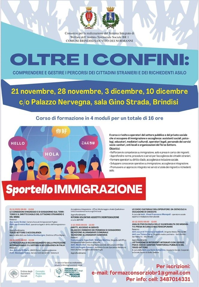 Il Consorzio ATS BR1 (Brindisi – San Vito dei Normanni) organizza il corso di formazione gratuita per operatori del sociale: “OLTRE I CONFINI: comprendere e gestire i percorsi dei cittadini stranieri e dei richiedenti asilo” 4 moduli – 16 ore totali 21 e 28 novembre, 3 e 10 dicembre 2025. Il percorso è rivolto a… Continua a leggere OLTRE I CONFINI