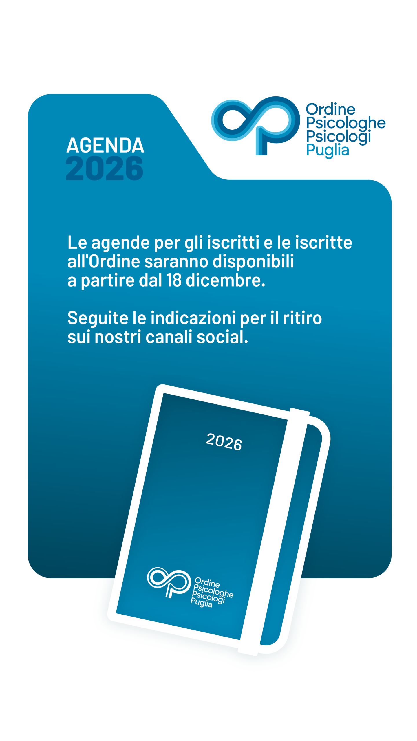 L’Agenda 2026 dell’Ordine delle Psicologhe e degli Psicologi Puglia è finalmente qui! Ritirala dal 18 dicembre presso uno dei punti di distribuzione nelle principali città e paesi della Regione. Quest’anno abbiamo voluto fare una scelta di sostenibilità innovando la modalità di distribuzione. Gli esuberi degli anni precedenti e le ingenti spese di trasporto ci hanno… Continua a leggere È arrivata l’Agenda 2026!