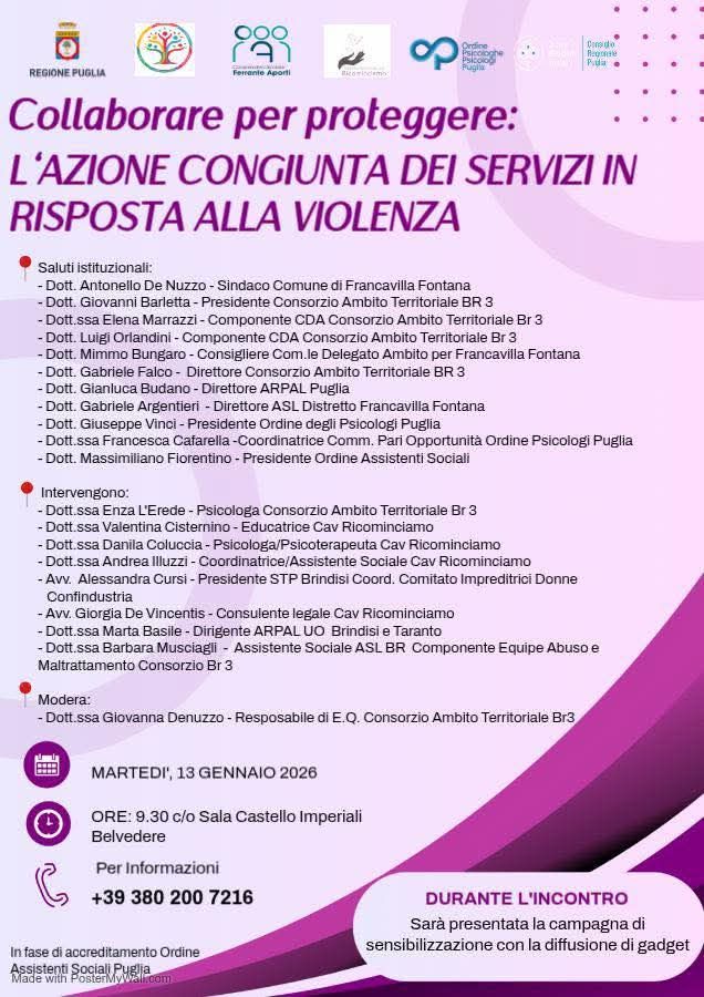 Il Consorzio Ambito BR3 di Francavilla Fontana e il CAV Ricominciamo , gestito dalla cooperativa Aporti, organizzano il 13 gennaio 2026 alle ore 9:30, il convegno “Collaborare per proteggere l’azione congiunta dei servizi in risposta alla violenza”. L’incontro punta a rafforzare la collaborazione tra le istituzioni, valorizzare il lavoro di rete attraverso linguaggio condiviso, individuare… Continua a leggere Convegno “Collaborare per proteggere l’azione congiunta dei servizi in risposta alla violenza”