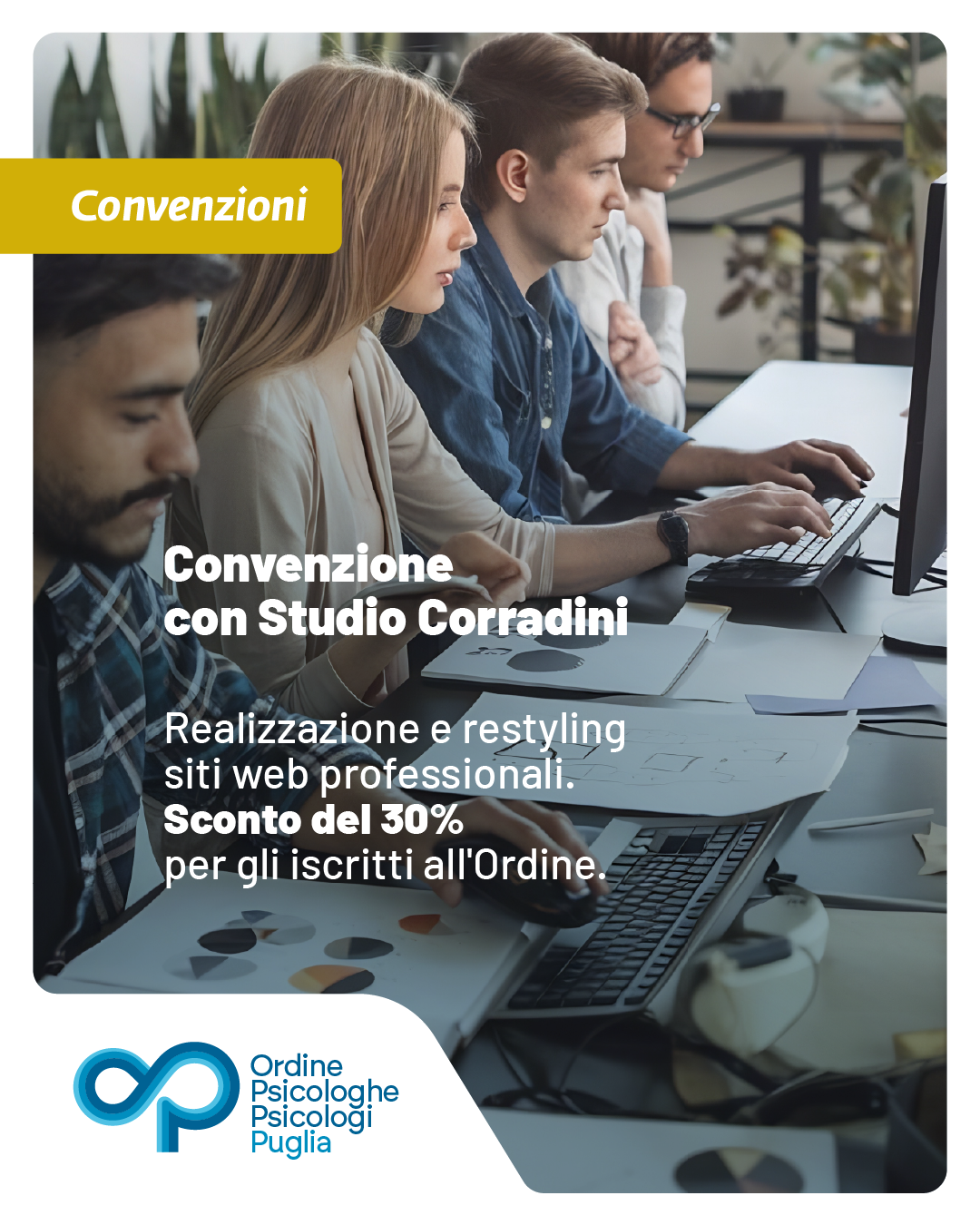Convenzione dell’Ordine con lo Studio Corradini per realizzazione e restyling siti web professionali. Per gli iscritti all’albo è previsto il 30% di sconto per la realizzazione di un nuovo Sito Web o per il Restyling di un Sito Web, come da allegato. Per ulteriori informazioni è possibile consultatare il relativo documento e i link che… Continua a leggere Convenzione con Studio Corradini per realizzazione e restyling siti web professionali