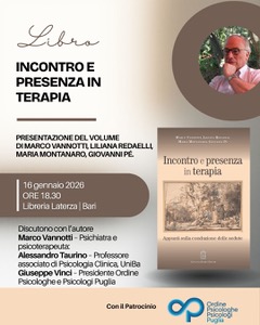 Presentazione del volume “Incontro e presenza in terapia” di Marco Vannotti, Liliana Redaelli, Maria Montanaro, Giovanni Pé, pubblicato da Giovanni Fioriti editore. Si terrà presso la Libreria Ubik Laterza di Bari venerdì 16 gennaio 2026 alle ore 18.30. All’evento, che gode del Patrocinio dell’Ordine, parteciperanno Alessandro Taurino – Professore associato di Psicologia Clinica, UniBa –… Continua a leggere Presentazione del volume “Incontro e presenza in terapia” 16 gennaio, Bari